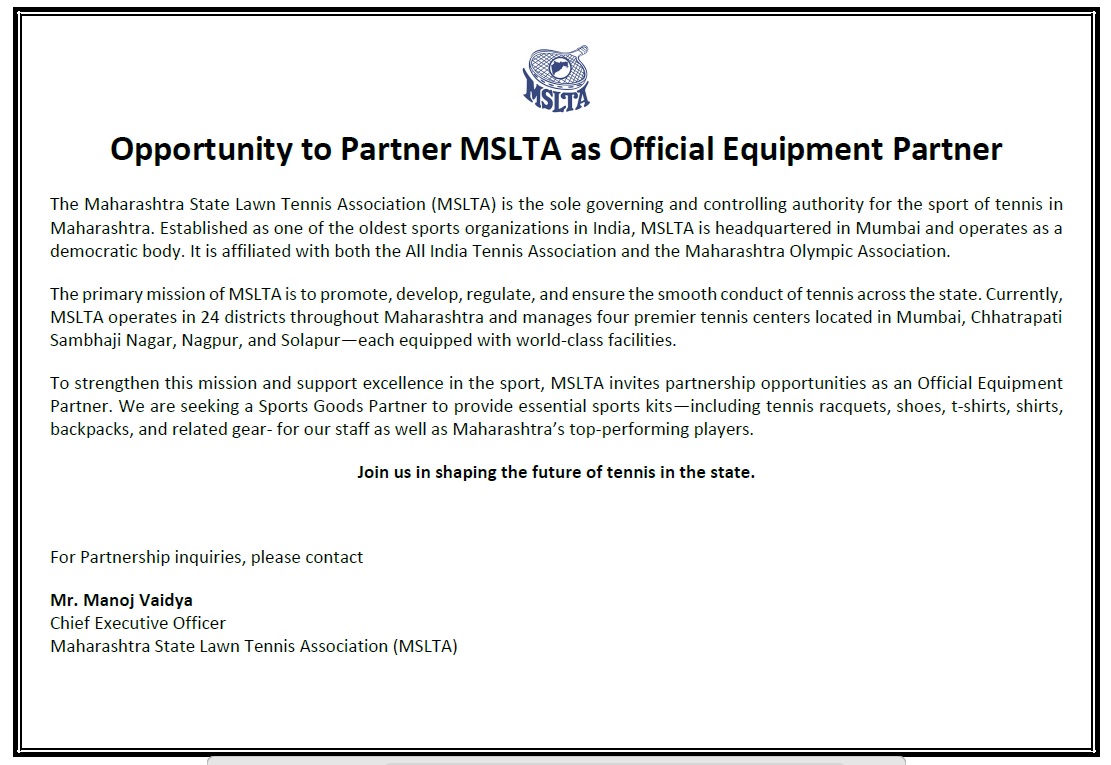 To strengthen this mission and support excellence in the sport, MSLTA invites partnership opportunities as an Official Equipment Partner. We are seeking a Sports Goods Partner to provide essential sports kits—including tennis racquets, shoes, t-shirts, shirts, backpacks, and related gear- for our staff as well as Maharashtra’s top-performing players.